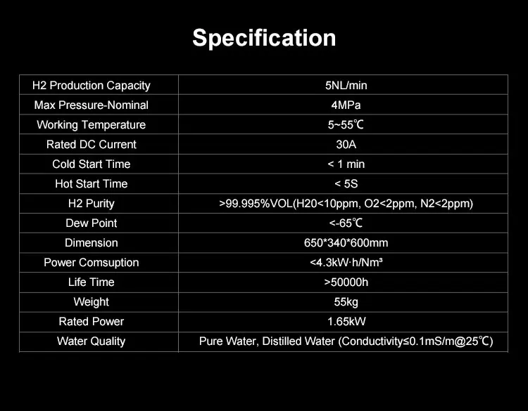 PEM Hydrogen Generator, designed to meet the growing demand for clean and sustainable energy solutions. This hydrogen generator uses pure deionized water (with an electrical conductivity of ≤0.1 mS/m at 25°C) to produce hydrogen through an electrochemical reaction, ensuring a green and pollution-free process. H2 Hydrogen Generation system uses a platinum catalyst and PEM (Proton Exchange Membrane)technology to split deionized water into its constituent parts, hydrogen (H2) and oxygen (O2), on either side of the membrane.