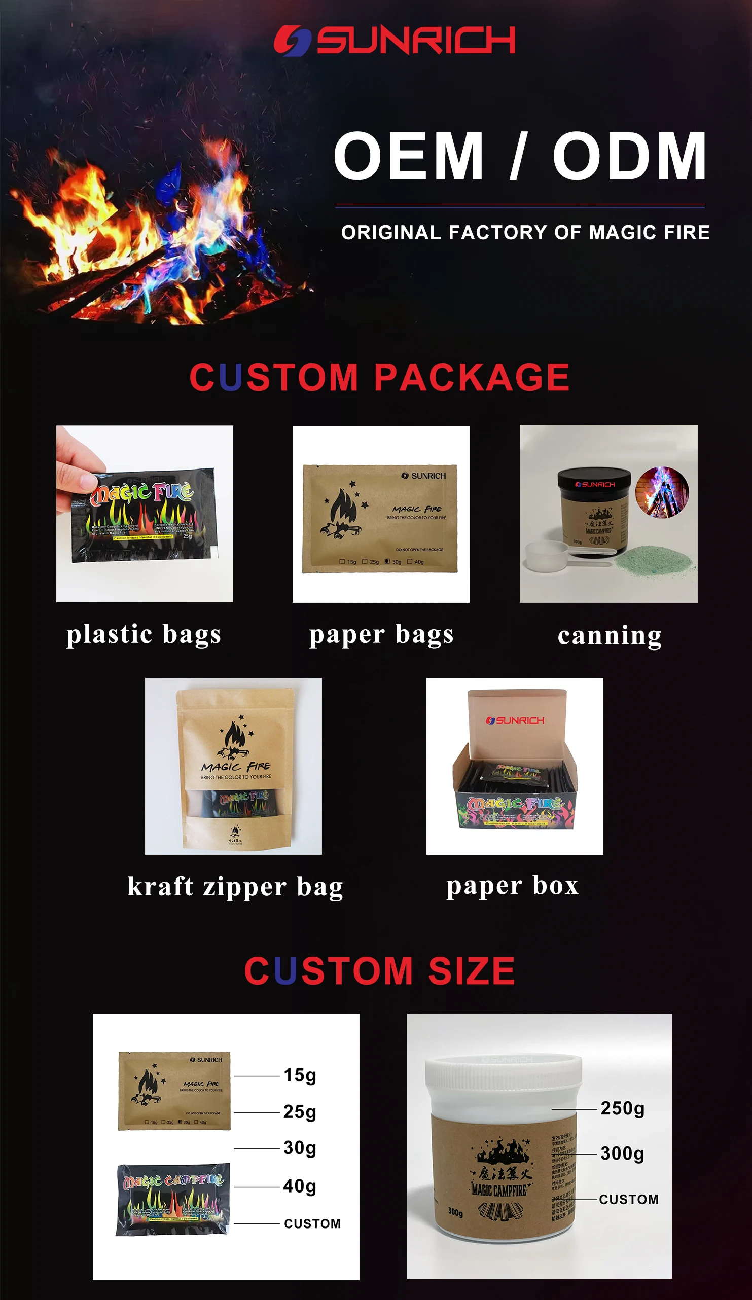 · It is suitable for campfires, fireplace etc. The principle of this product makes the flame colourful by adding different elements.
