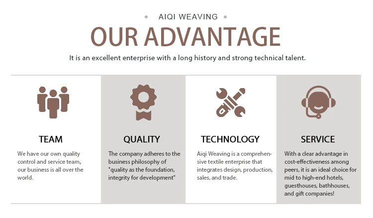 The company adheres to the business philosophy of "quality as the foundation, integrity for development", adopts international advanced management mode and textile technology, strictly implements GB-T22864-2009 industry standards, and produces products with excellent texture, exquisite craftsmanship, novel styles, complete varieties, and elegant taste. With a clear advantage in cost-effectiveness among peers, it is an ideal choice for mid to high-end hotels, guesthouses, bathhouses, and gift companies!