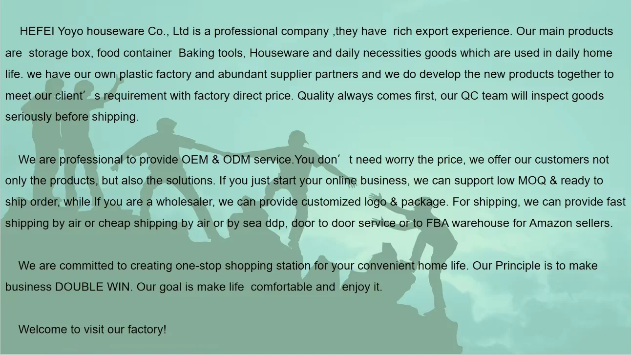 HEFEI Yoyo houseware Co.,Ltd is a professional company , they have rich export experience. Our main products are storage box, food container Baking tools, Houseware and daily necessities goods which are used in daily home meet . Welcome to visit our factory