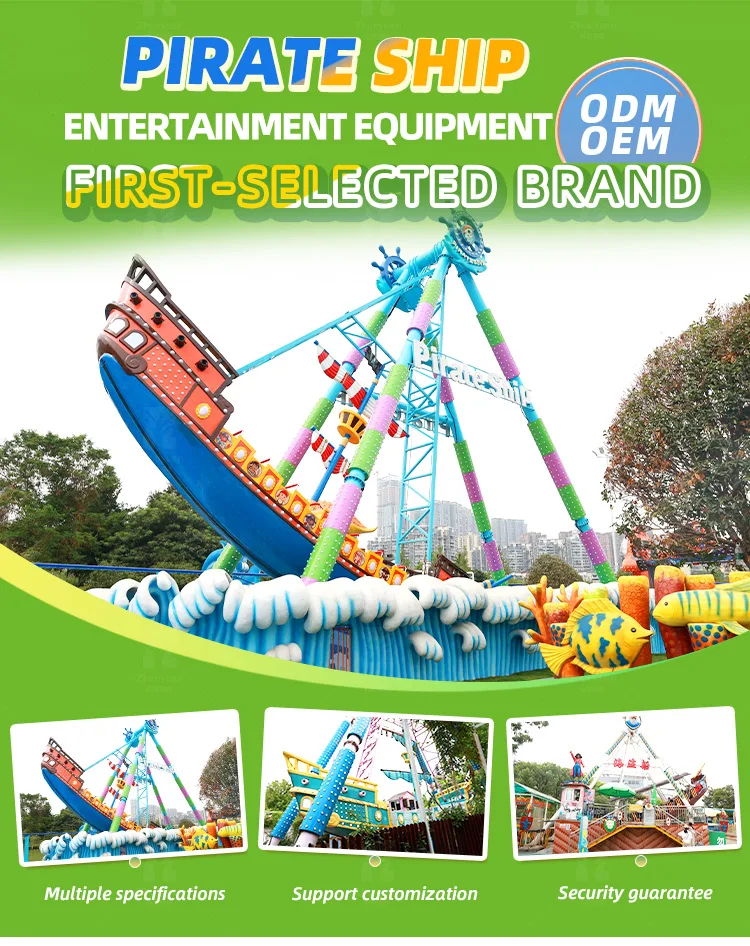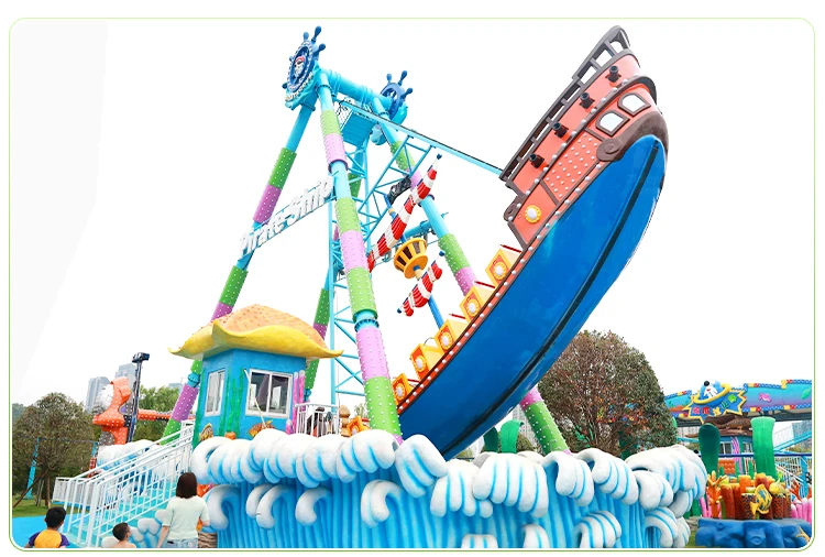 1. Authentic Design: Crafted with meticulous attention to detail, our pirate ship brings the spirit of the high seas to life. From the weathered planks to the towering masts, every inch screams adventure. 2. Safe & Exciting Rides: Equipped with state-of-the-art safety features, our pirate ship ride ensures a thrilling yet secure adventure for all ages. Suitable for 32 passengers, it's the perfect way to share the excitement. 3. Customizable Fun: Looking to make it your own? We offer customization options to tailor the experience to your theme park or event. From custom graphics to sound effects, the possibilities are endless. 4. Durability & Reliability: Built to last, our pirate ship is constructed from high-quality materials that withstand the test of time. Enjoy years of trouble-free operation and countless hours of fun.