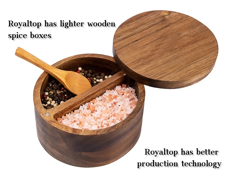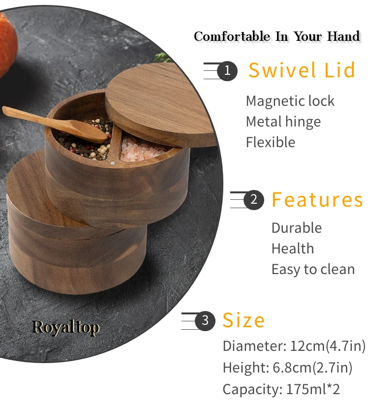3.Flexible Wooden Lid: The top lid of the spice container can be rotated 360° to open or close, which makes it easier to use. The magnetic lock on the lid makes one-handed operation possible.Royaltop has reinforced the fragile swivel shaft and we use metal to make it instead of small wooden sticks.