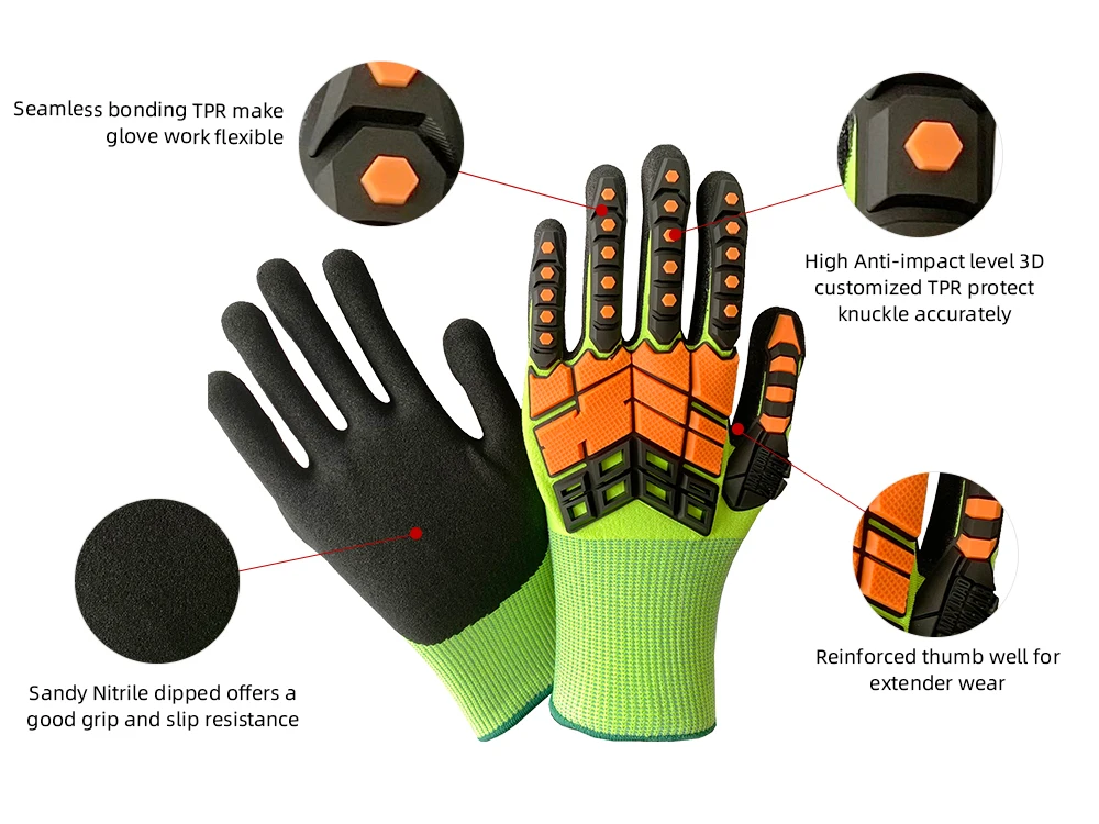 Name | OEM 15 Gauge sandy nitrile coating knitted working touch screen anti impact fluorescent safety gloves |