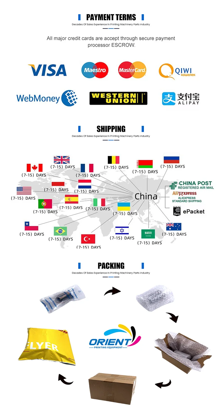 Orient Printing Equipment CO.,LTD is located in Baiyun District, Guangzhou. We have large stock of printing press parts. Parts available for immediate delivery. Our replacement parts inventory for Heidelberg, Komori, Roland offset presses includes, but not limited to, original printed circuit boards, gripper fingers, alcolor drive motors, ink rubber rollers, ink teflon rilsan rollers, gripper bars, washup blades, air cylinders, bearings, ect. We pride ourselves on the quality of our business. we are the premier supplier of replacement parts for offset printer parts. With our decades of experience in servicing customers with parts for offset presses you can call upon our expertise in getting the correct part to get your machine up and running. Professional, quality and efficient! Let's be your best partner for printing machinery parts!
