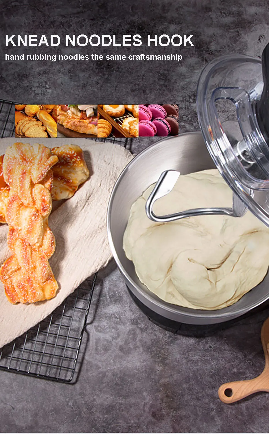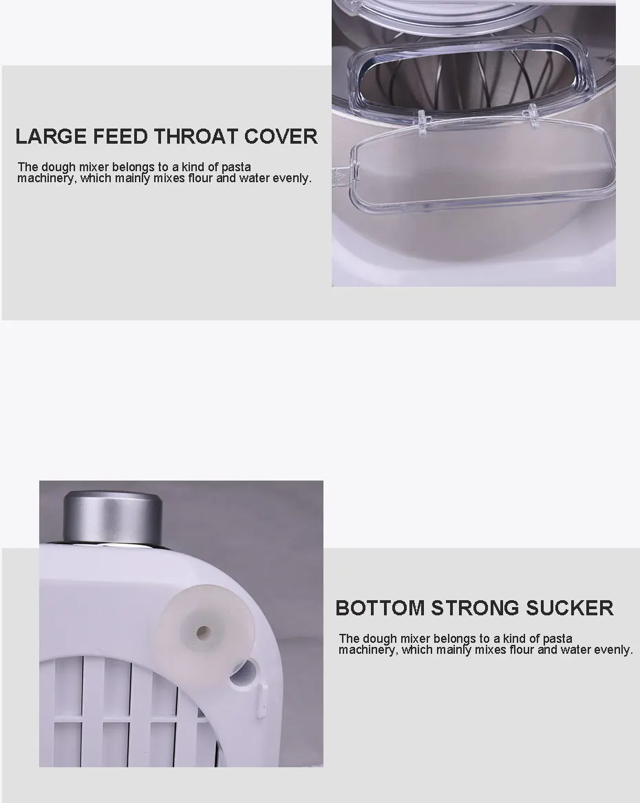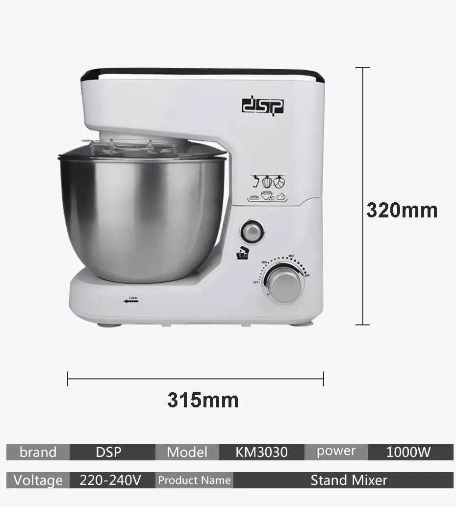 Voltage: 220-240V~50Hz Output: 1000W Capacity: 5.0L 8830 Copper clad aluminum motor Special robust gear mechanism Planetary rotation for thorough mixing Stainless Steel bowl Detachable transparent bowl-cover prevents splash Pouring chute on cover enables adding ingredient when mixing Detachable kneading hook, whisk and flat beater Electronic stepless speeds control Tilt-up head for easy removal of bowl Head lock button for safety