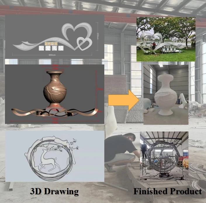 Crafts | (1) Make a clay draft model (2) Enlarge the draft in proportion (3) Make the clay draft into a hard material mold (4) Cast the sculpture part according to the mold (5) Weld the sculpture |