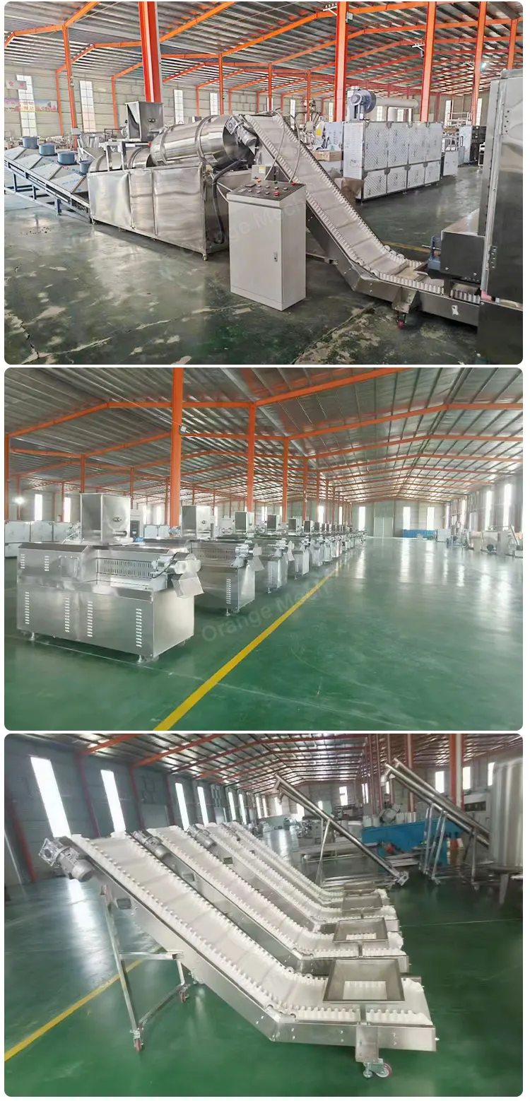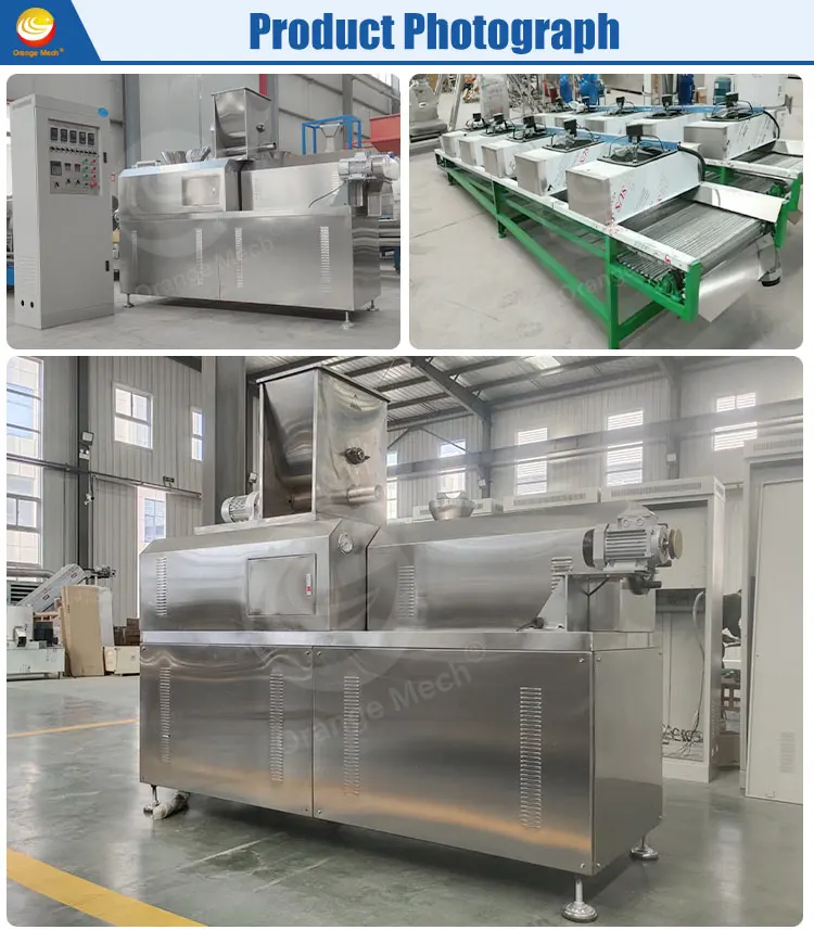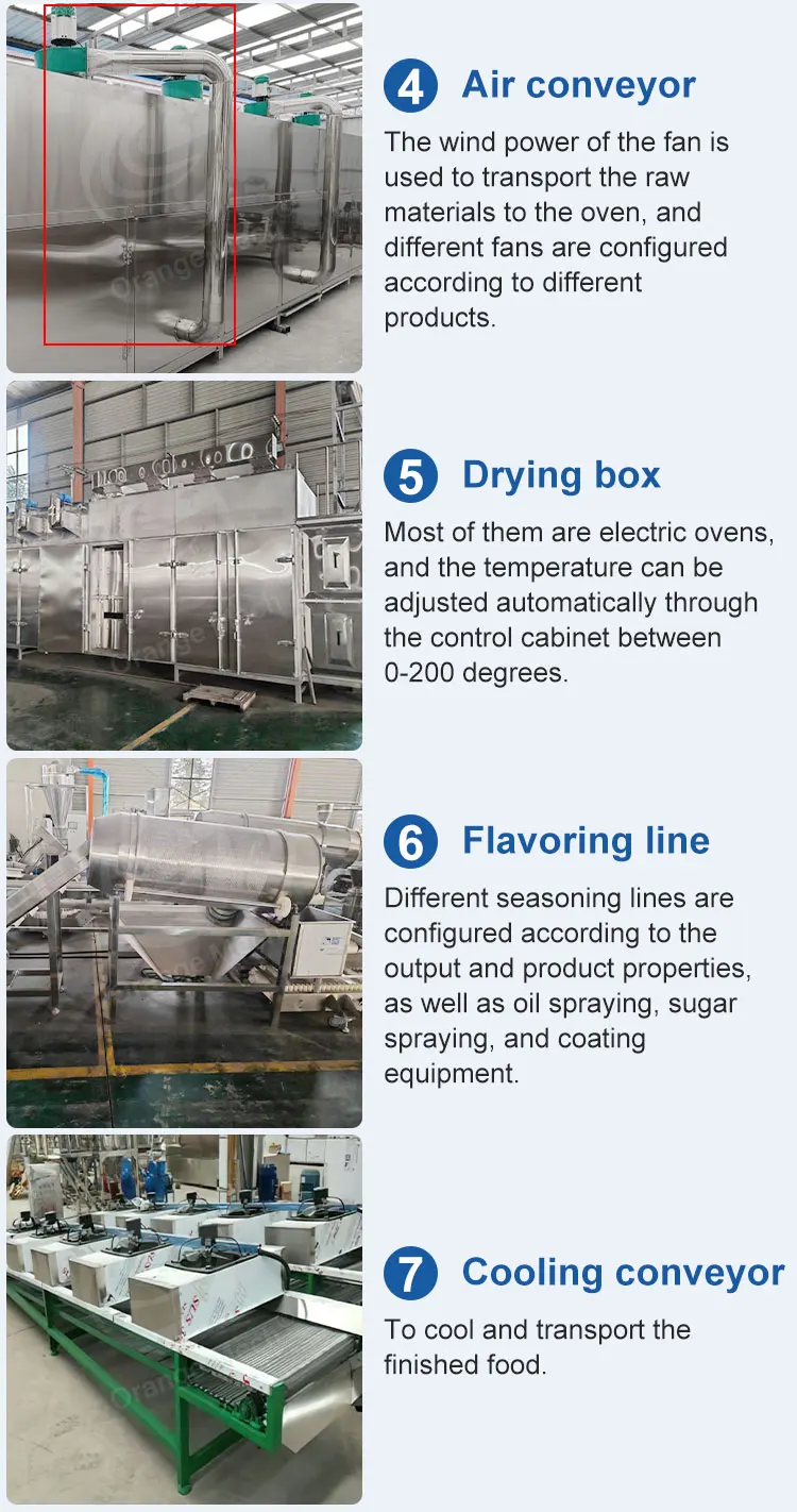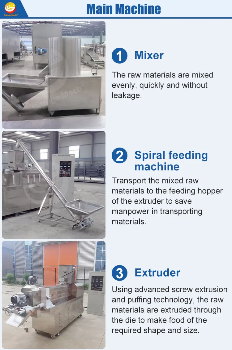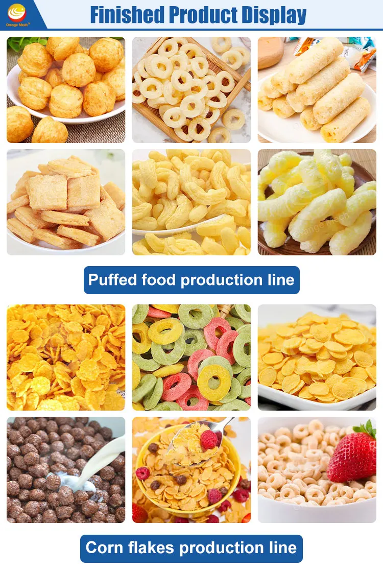 By changing the mold and selecting the appropriate production process, puffed products such as sandwich rice crackers, sandwich cakes, wheat barbecue, wheat-flavored chicken nuggets, nutritious breakfast, and corn flakes can be produced.