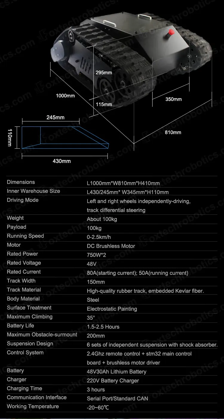 TS5.0 crawler tracked robot chassis is made of high carbon steel body, and equipped with 6 sets of independent suspension with shock absorber, which makes the chassis durable and has excellent shock absorption effect, allowing it to climb easily and flexibly under high load operation.