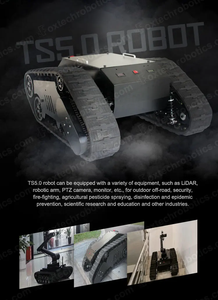 TS5.0 robot can be equipped with a variety of equipment, such as LiDAR, robotic arm, PTZ camera, monitor, etc., for outdoor off-road, security, fire-fighting, agricultural pesticide spraying, disinfection and epidemic prevention, scientific research and education and other industries.