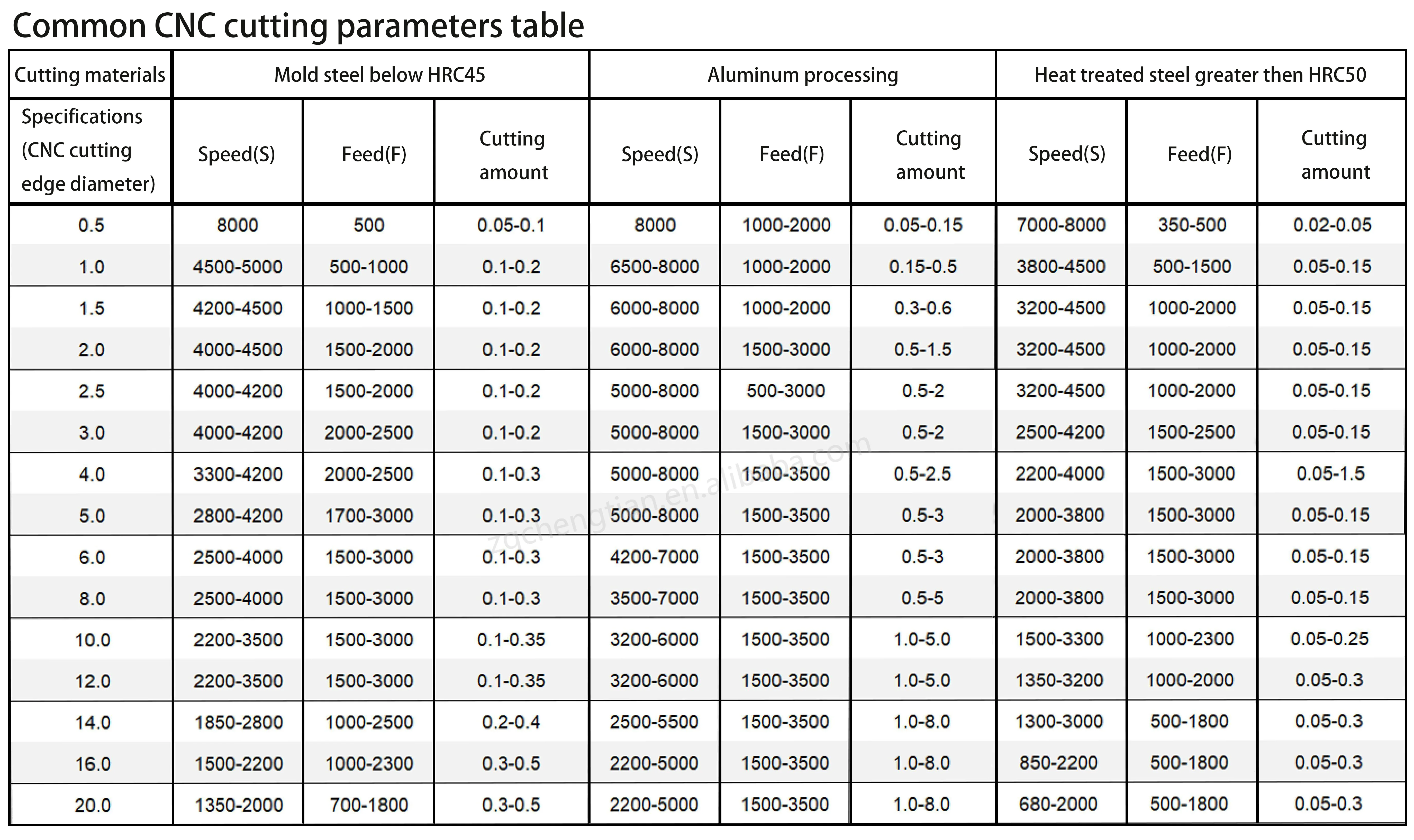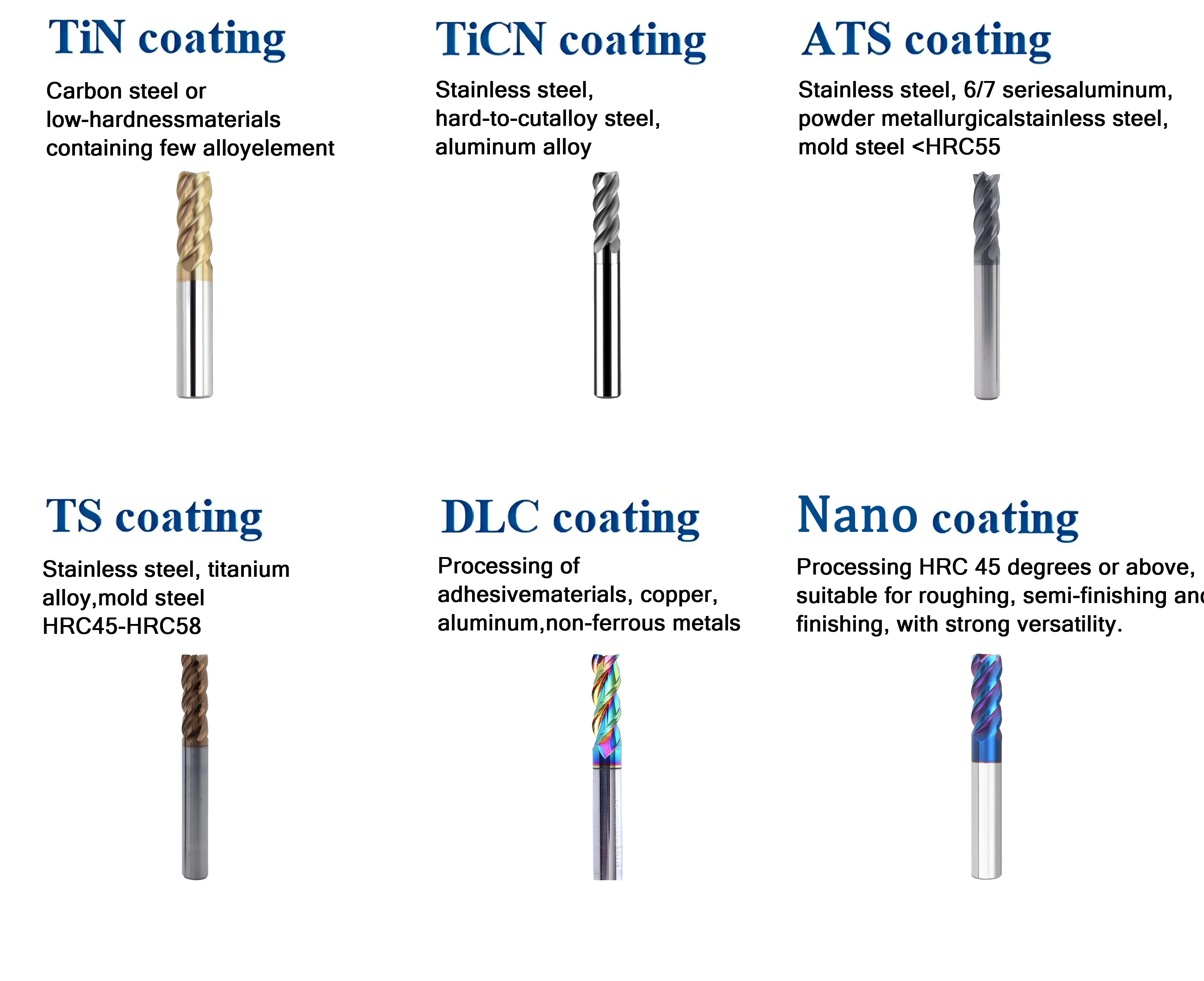 Suitable for | Cast iron, Stainless steel, mould steel, carbon steel, titanium alloy, tool steel, heat-treated steel, aluminum alloy, etc | |||||||
