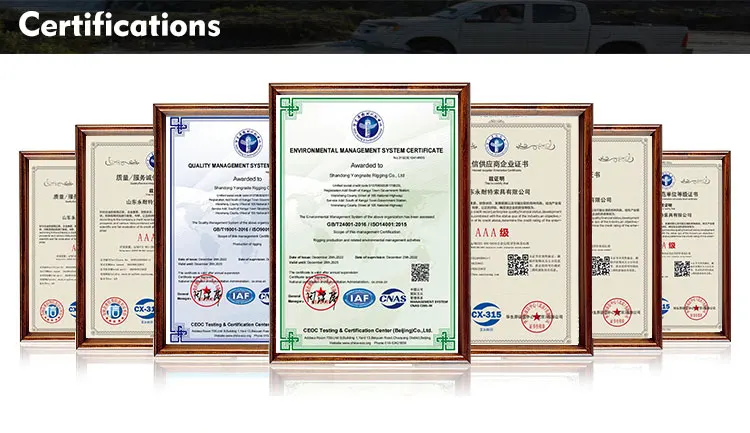 Shandong Yongnaite Rigging Co., Ltd. is located in the industrial park of Kangyi Town, Wenshang County, Shandong Province, the capital of Buddhism in China. It borders Qufu, the hometown of Confucius, Liangshan, the birthplace of the Water Margin culture, Mount Taishan, the Five Mountains in the north, and Weishan Lake in the south. Located adjacent to the entrance of National Highway 105, Jixu Expressway, and Ridong Expressway, and 40 kilometers south of Jining Airport, with convenient transportation.Our company currently has more than 100 employees, including more than 30 management and technical personnel. The registered capital is 20 million yuan, covering an area of 100 acres, and constructing a modern workshop of 10000 square meters. The company has production equipment, strong technical strength, scientific testing methods, and a complete quality management system, integrating research, development, and production. The technical strength is strong, and more than 30% of the employees hold intermediate and intermediate titles of engineering and technical personnel. All supporting equipment is complete, production processes are complete, and a complete quality assurance system is in place. The product quality is strictly controlled, striving for excellence, and the product qualification rate is 100%.