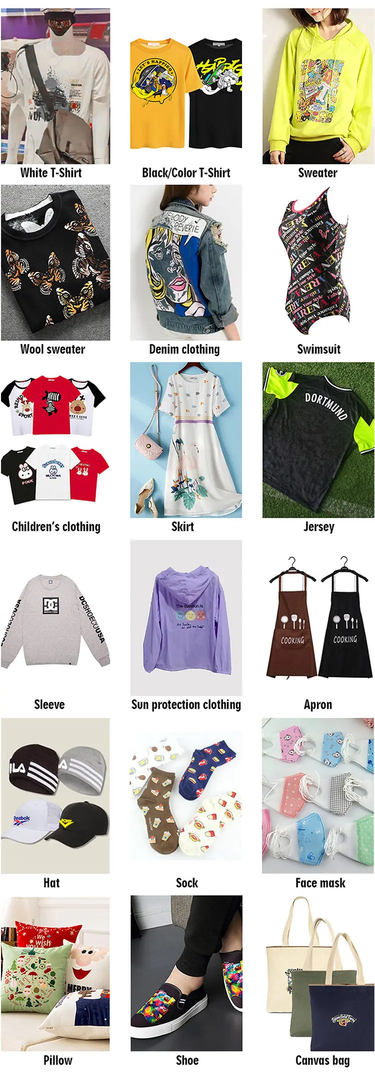 A: You can print on T-shirt, Hoodies, Jeans, Swimsuit, Polo, Pillow, Hat, Shoes,etc.
