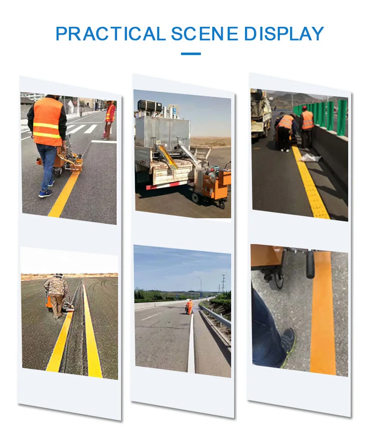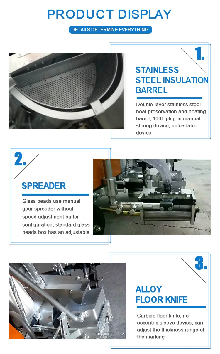 Self-propelled Hot Melt Thermoplastic Road Marking Machine Features of hand push type pavement hot melt spray thermoplastic type road markings machine 1. The scribing bucket with special alloy material with good thermal conductivity to ensure no deformation during use. 2. The crossed bucket adopts double rod design, which is more convenient to use. for uneven old pavement construction. The wheels are made of special rubber, which is resistant to high temperature,wear and tear, good elasticity, labor saving, and good construction stability. 3. The movable carbide floor blade can be designed to make the linear cutting edges neat and tidy. 4. Adjustable hand push handle, height can be adjusted as required. 5. Stainless steel double-layer thermal insulation bucket, high temperature resistance and no rust. 6.Vertical manual stirring device, easy to stir.