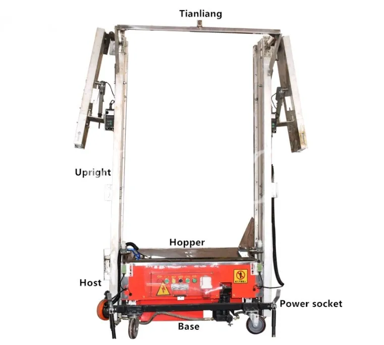 Wall Plastering Machine is also known as: Wall finishing machine. It is a machine specially designed for wall plastering. A hoist with a vertical gantry and a counter scraper frame is mounted on the upper surface of the chassis, and a hopper above the chassis and connected to the chassis is installed inside the two columns of the scraper frame. The hopper can be slidably attached to the two columns by the hoisting machine. One side of the gantry is provided with a discharge opening on the upper façade of the hopper, and a squeegee is mounted on the lower part of the discharge opening; in the hopper, along the width direction thereof Supported by a dial roller, the motor is connected to the dial by a speed reducer, and the other end of the hopper is provided with a feed port