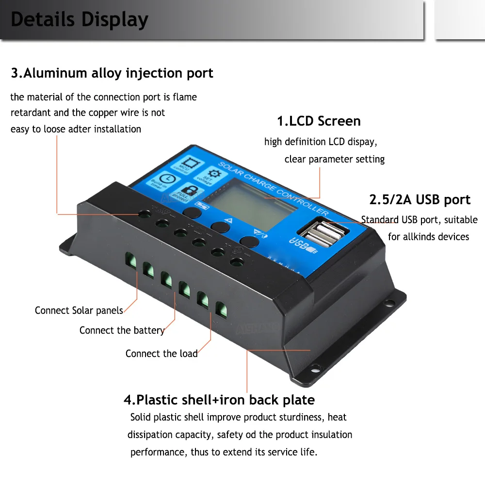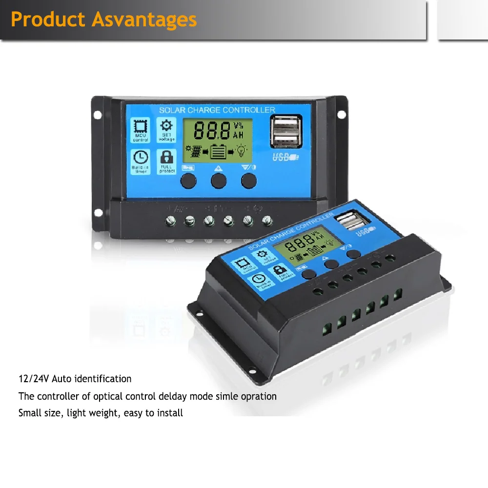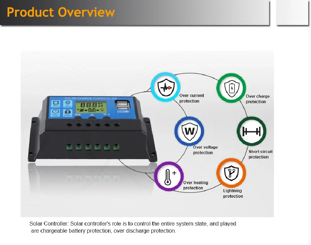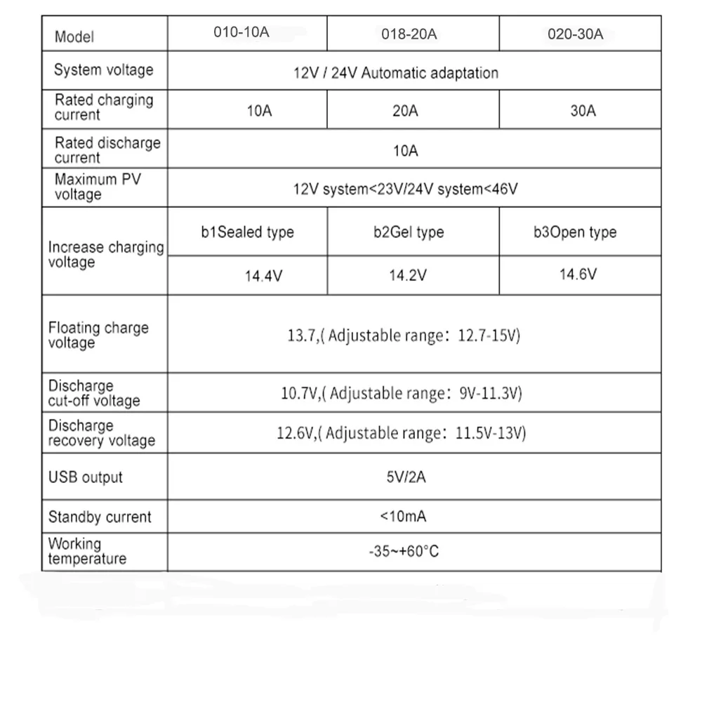 Connection: 1.Connect the battery to the charge regulator - plus and minus. 2.Connect the photovoltaic module to the regulator - plus and minus. 3. Connect the consumer to the charge regulator - plus and minus.