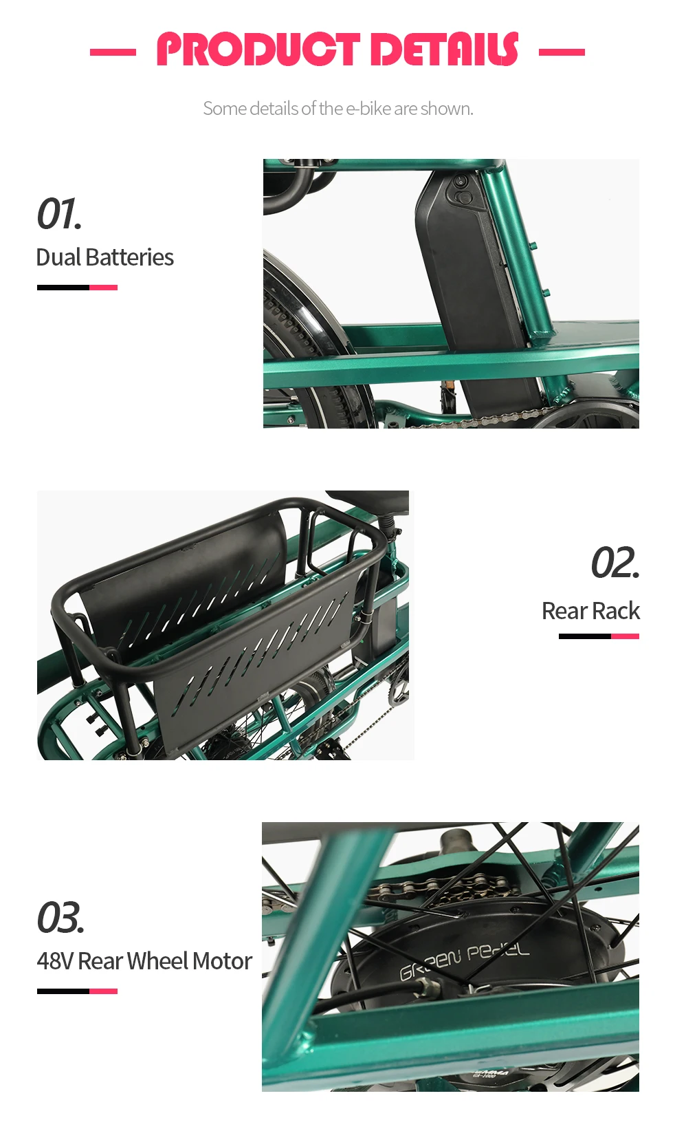Motor | Rear wheel 48V 500W motor (Greenpedel Brand) | |