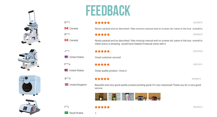 Q4: How long is the order lead time and the warranty? A4:For stock item blanks: 1-3 working days; with custom print: 5-7 working days. For non-stock items, lead time: 15-20 working days. Warranty: usually 1 Year for all machines. Q5: What certificates do you have? A5: Factory qualification: ISO9001, BSCI; Heat press machine qualification: CE, Rohs, ETL Sublimation blanks qualification: SGS, Intertek, FDA, REACH, LFGB.
