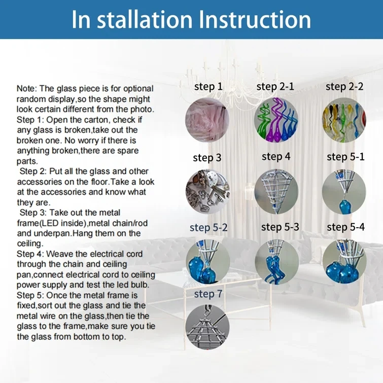 2.This glass is totally handmade and DIY product, as for different installation , the finished chandelier may not 100% as the photo shown, order it if you can accept!