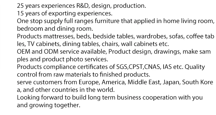 A:Yes, we can help sources other furniture, we have long term business cooperated with more than 100 factories in China so that we can get any furniture in reasonable price and reliable quality.