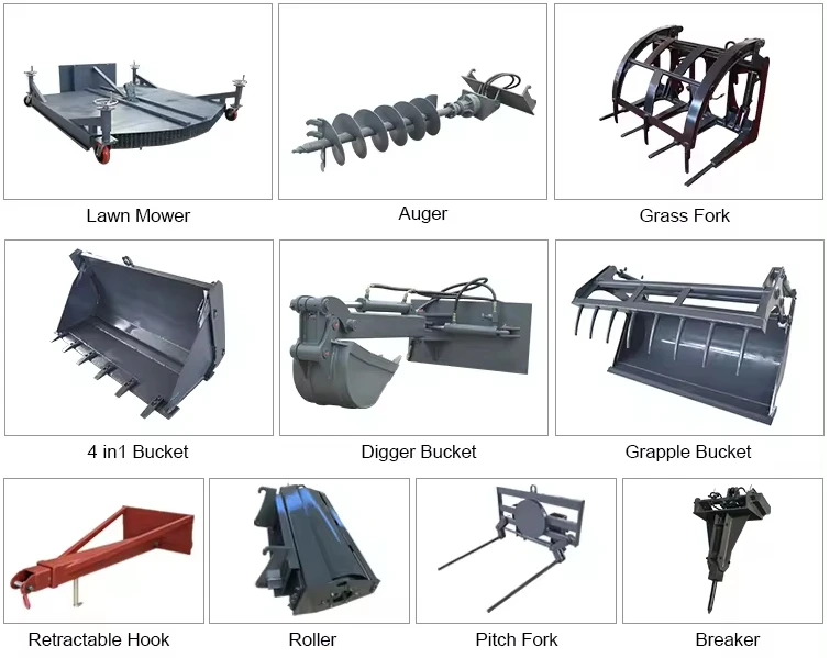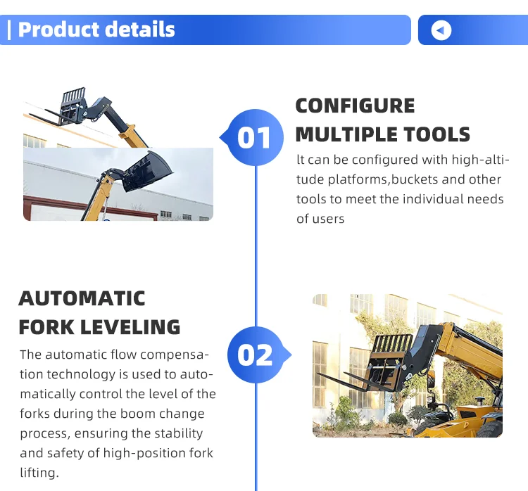 Our telescopic forklifts can also be equipped with forks, manned platforms, leveling devices, farm operation lifting devices, etc., and the replacement of various devices is very convenient. It can also be equipped with more than 20 kinds of attachments such as soil drills, handling forks, buckets, glass sweepers, drill bits, etc.