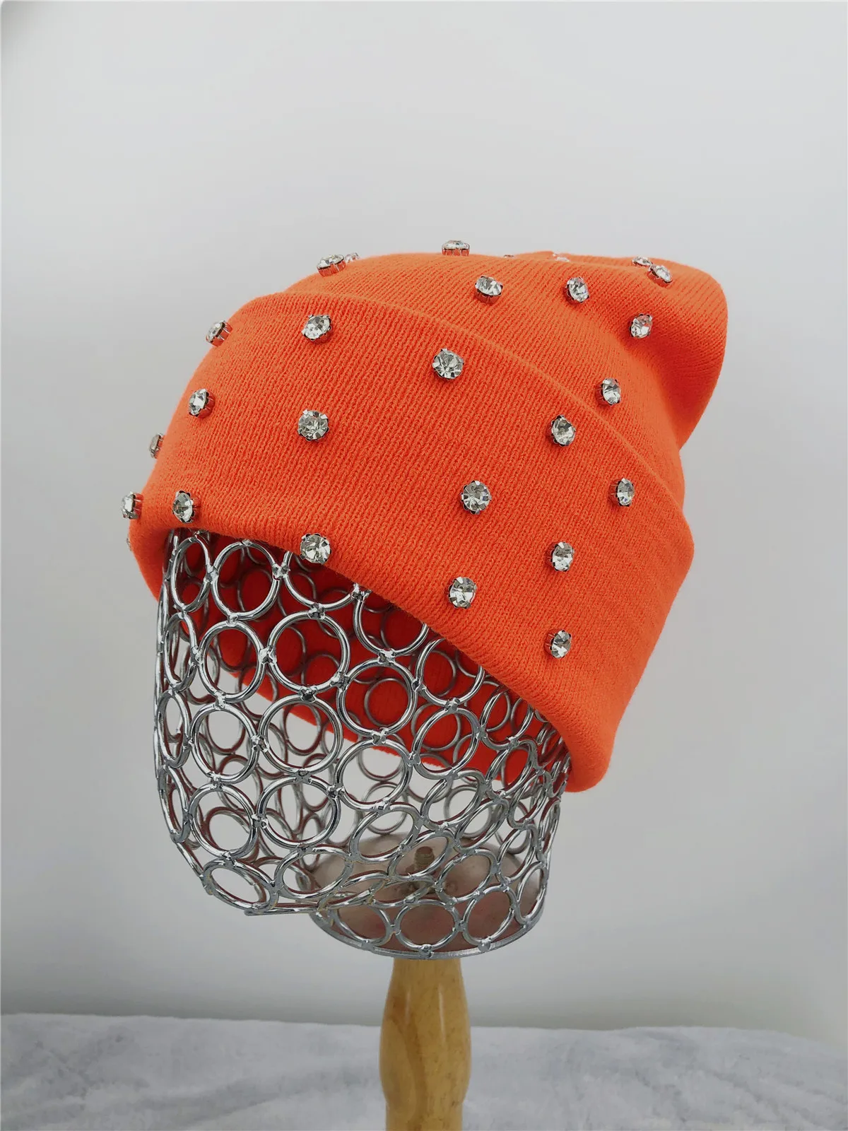 Women Thick Knit Crystals Beanie Stones Tuque Neon Orange Warm Sports Skull Cap Hot Pink White Rhinestones Winter Hat