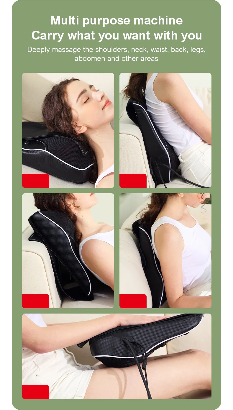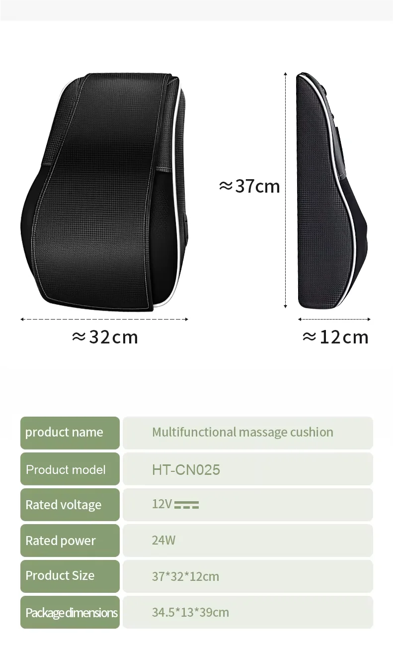 1.10D kneading pushing massage. 2.two-way directions could be changed. 3.3 gears massage and 1 gear constant heating. 4.Vibrating massage and Ay Tsaohot compress on the back. 5.Manual air bag stretching. 6.4pcs magnet stones maintain. 7.Breathable cloth suitable for a long time sitting. 8.S-type cervical spine support design. 9.With remote controller. 10.15 mins auto-off.