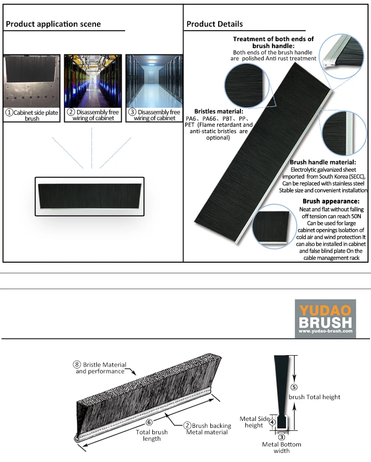 Yudao Brush has long term supply cabinet wiring brushes and strip brush for companies such as Schneider, APC, HP, Microsoft Cloud,Google Cloud, Amazon Cloud, Baidu Cloud, Alibaba Cloud, Tencent, Whirlpool, Rittal, Foxconn, Delta, Vertiv and charge-point, as well as hair dyeing combs for companies such as L'Oreal, supply elevator safety brushes for Mitsubishi Elevator, wooden handle shoe brushes and cleaning brushes for supermarkets such as Auchan. |