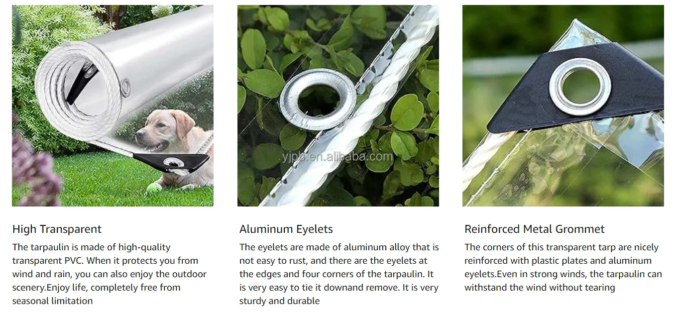 Features: * 14MIL CLEAR VINYL TARP :clear tarp is made of high quality transparent PVC vinyl material .The clear design of the tarpaulin makes it an excellent choice for outdoor activities such as camping, picnics, or outdoor events where you want to enjoy the view while still being protected from the elements.Clear vinyl tarp allows light to pass through it .The sun shines through and gives us some much needed sunlight while protecting us from the cold