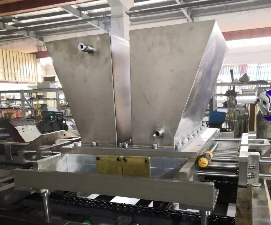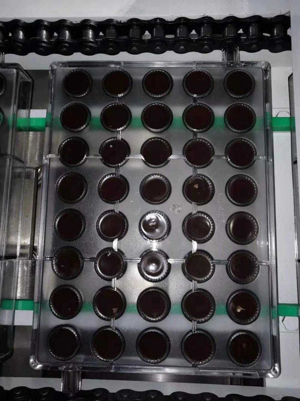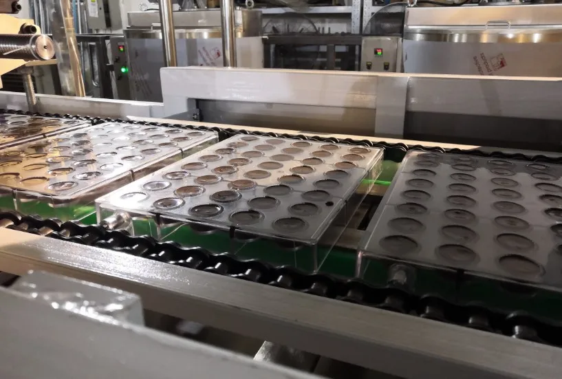 The chocolate depositing/moulding machine of our company is a dedicated and advanced chocolate molding equipment. It is electromechanical. The whole production process includes depositing, mould vibrating, cooling, demoulding, conveying, mould drying etc.
