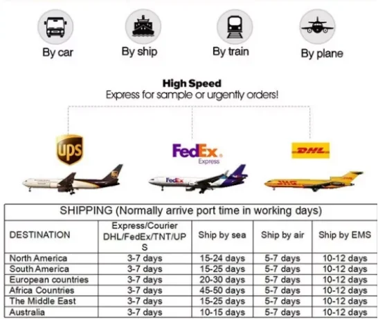 A: By sea to your nearest port.By air to your nearest airport.By express (DHL, UPS, FEDEX, TNT, EMS) to your door.