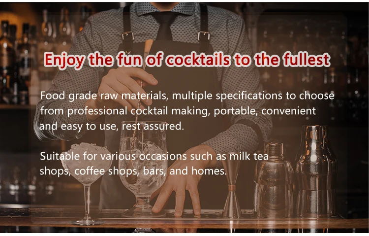 Size | Shaker:750ml 550ml Muddler: 3.3*20.5cm Bar Spoon: 25.5cm 22cm Jigger: 15/30ml 20/40ml Straws brush :23cm |