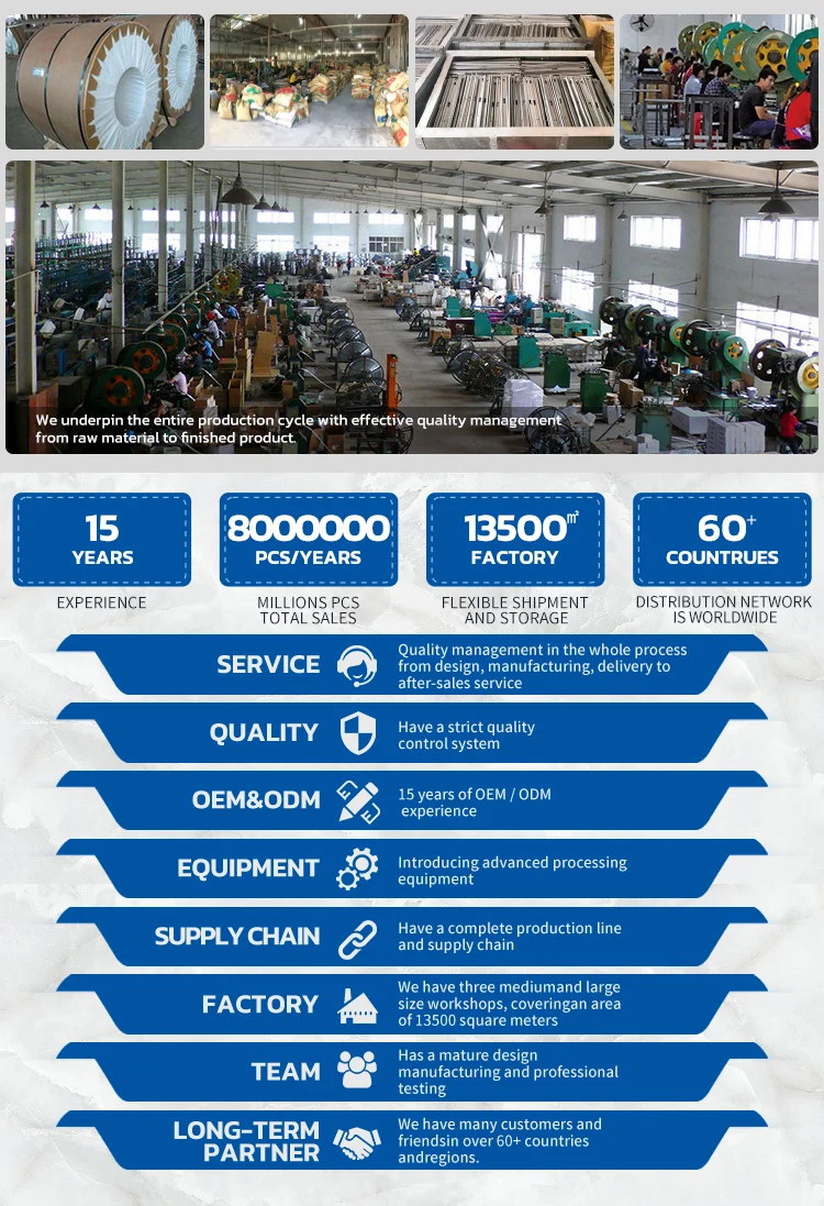 Q5: What are our advantages? A5 1. Strict QC: For each order, the QC department will conduct a strict inspection before shipment. Poor quality will be avoided inside the door. 2. Transportation: We have transportation department and freight forwarder, so we can guarantee faster delivery and keep the goods well protected. 3. The factory supports one-stop procurement, specializing in the production of metal box drawer systems, hinges, dampers and other furniture accessories.