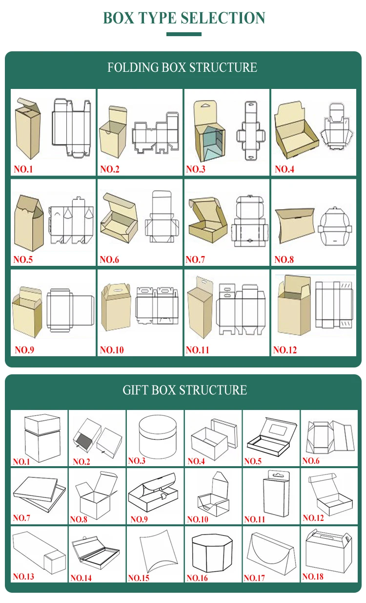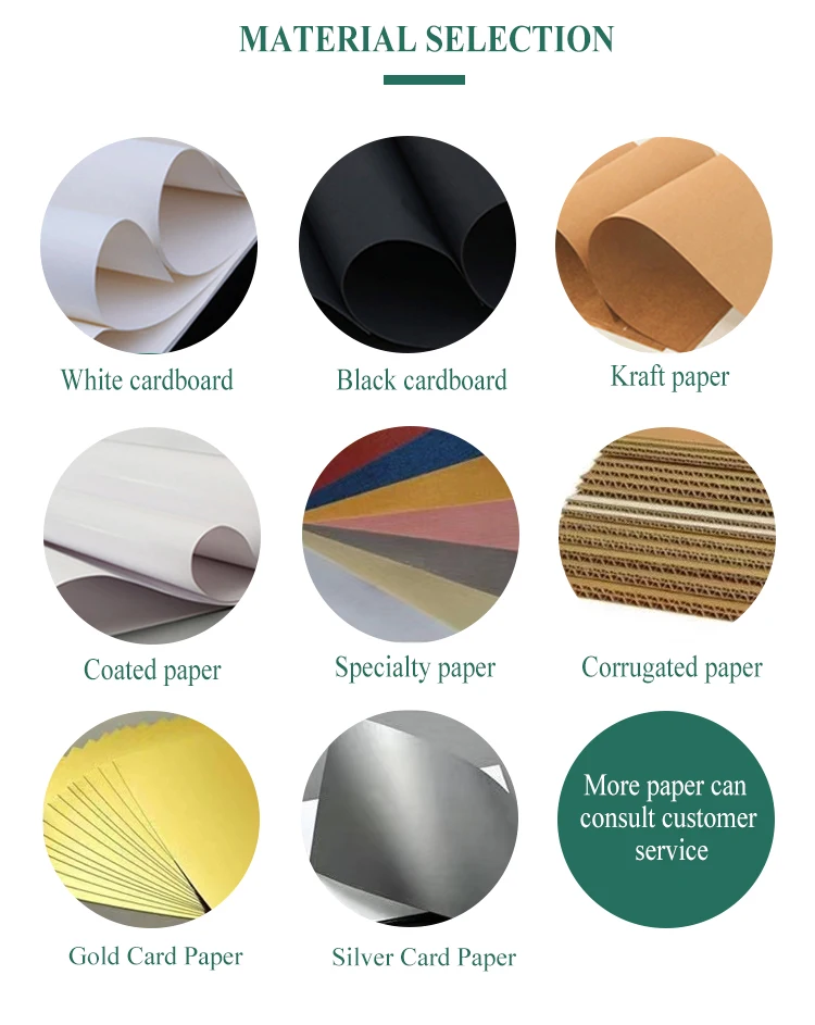 Materials | 250g / 300g / 350g / 400g C1S art paper, C2S art paper, brown kraft paper, grey paper,corrugated paper, fancy paper, etc. | ||||||