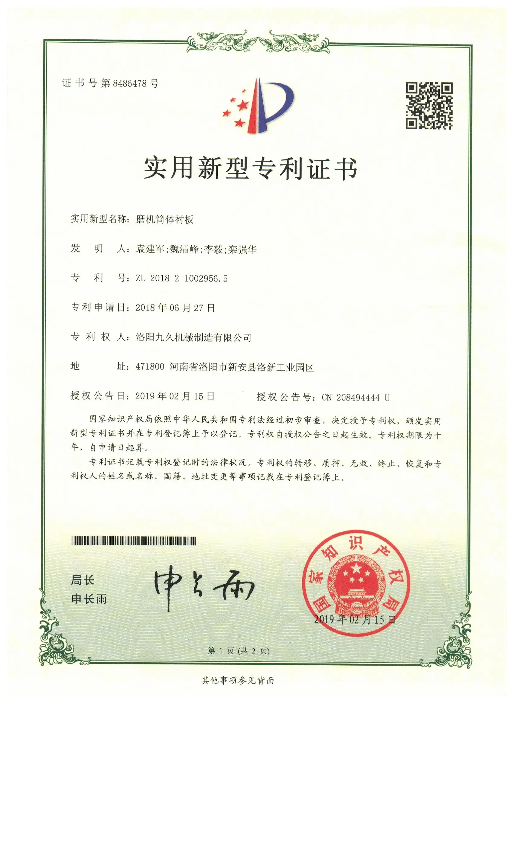 diagram of the lining plate, the product qualification certificate, and the shipping details table.