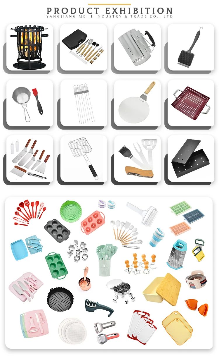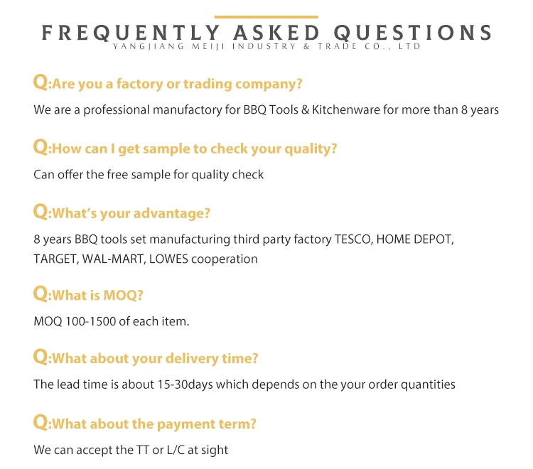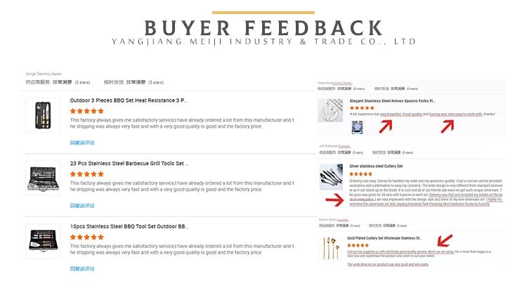 | Size | Shovel: 43.5*8.5cm; 294g Tongs: 46.5*4.3cm; 380g Fork: 43.5*3.3cm; 200g Knife: 43.5*2.5cm; 210g |