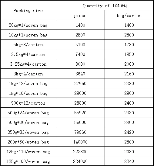 Size | 15G,18G,30G,35G,50G,60G,80G,100G,110G,125G,200G,250G,350G,500G,1KG,2KG,3KG,3.25KG, 3.5KG,9KG,10KG,11KG,15KG,20KG,25KG, customized optional |