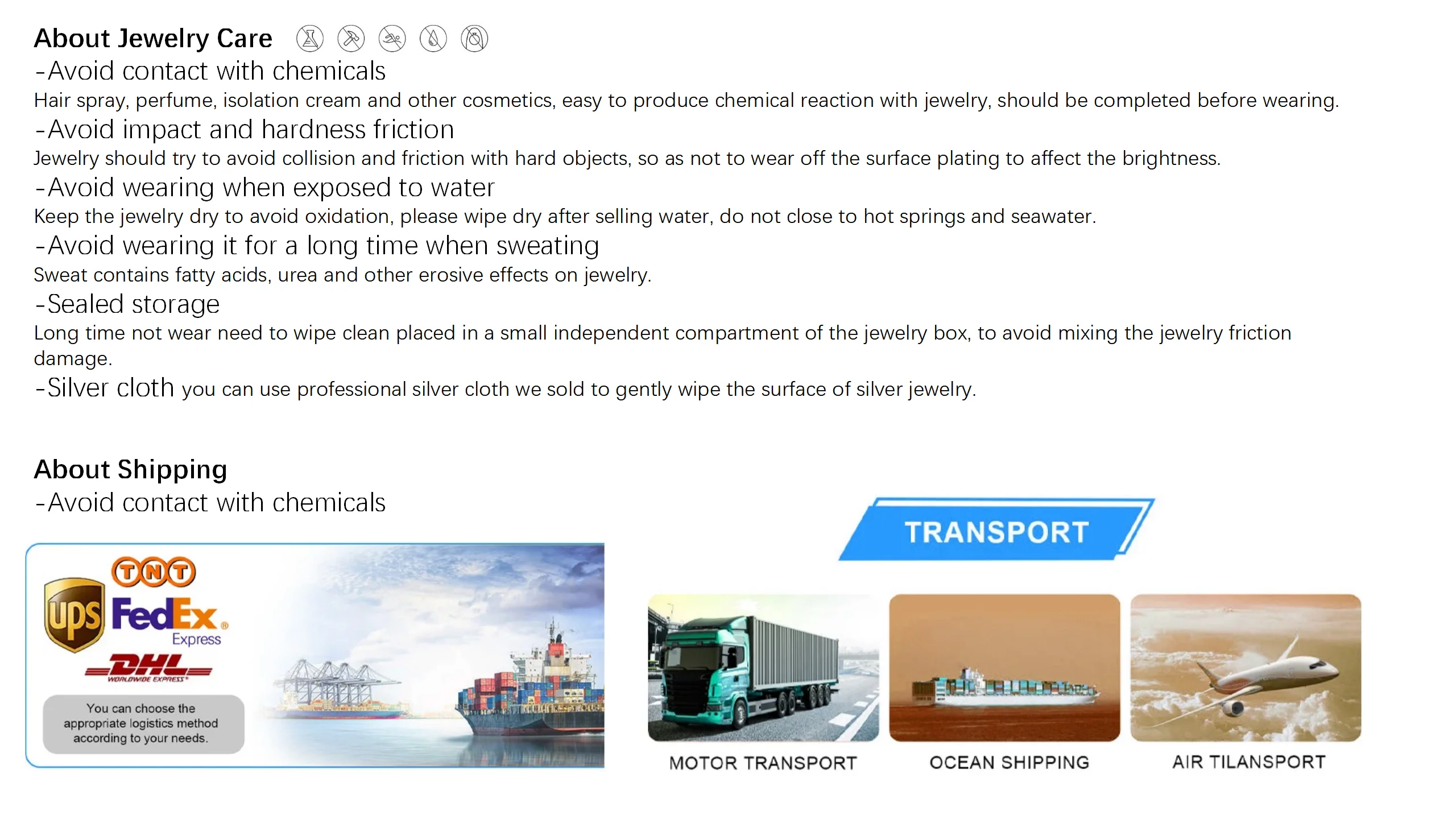 -Avoid contact with chemicals Hair spray, perfume, isolation cream and other cosmetics, easy to produce chemical reaction with jewelry, should be completed before wearing. -Avoid impact and hardness friction Jewelry should try to avoid collision and friction with hard objects, so as not to wear off the surface plating to affect the brightness. -Avoid wearing when exposed to water Keep the jewelry dry to avoid oxidation, please wipe dry after selling water, do not close to hot springs and seawater. -Avoid wearing it for a long time when sweating Sweat contains fatty acids, urea and other erosive effects on jewelry. -Sealed storage Long time not wear need to wipe clean placed in a small independent compartment of the jewelry box, to avoid mixing the jewelry friction damage. -Silver cloth you can use professional silver cloth we sold to gently wipe the surface of silver jewelry.