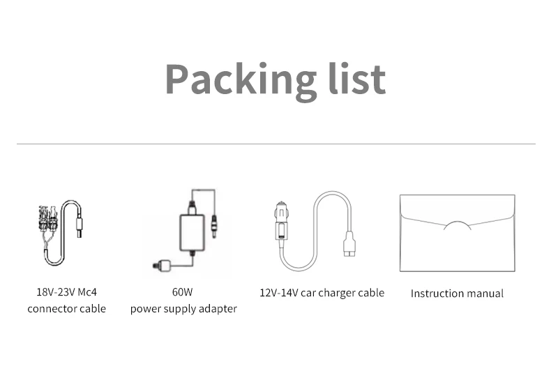 Standard Package Include | 1*M300 portable power supply, 1*60W power supply, 1*User Manual, color box packaging, 1*MC4 charging cable, 1*vehicle charging cable |