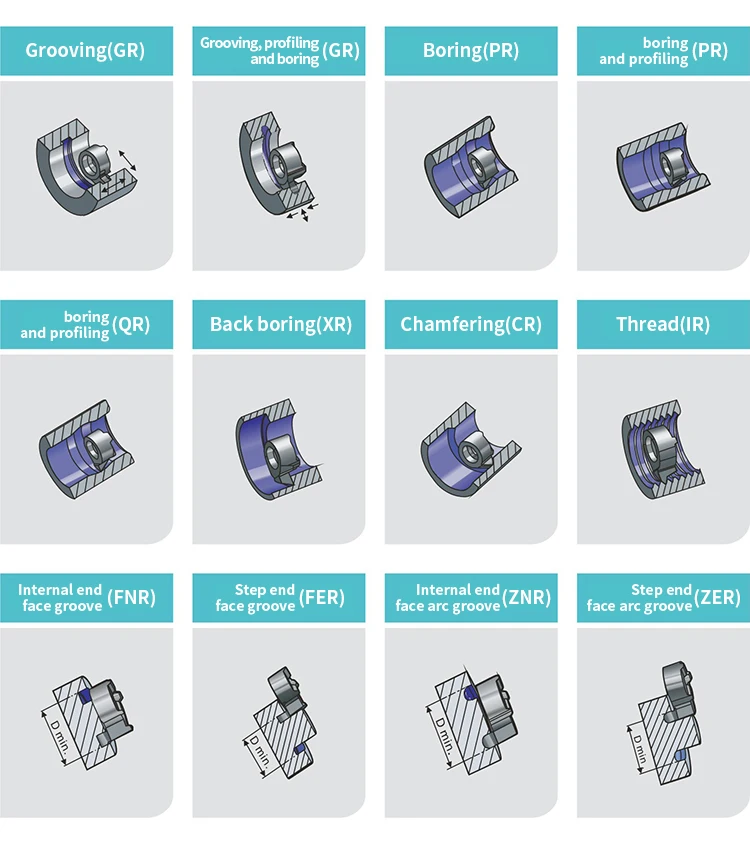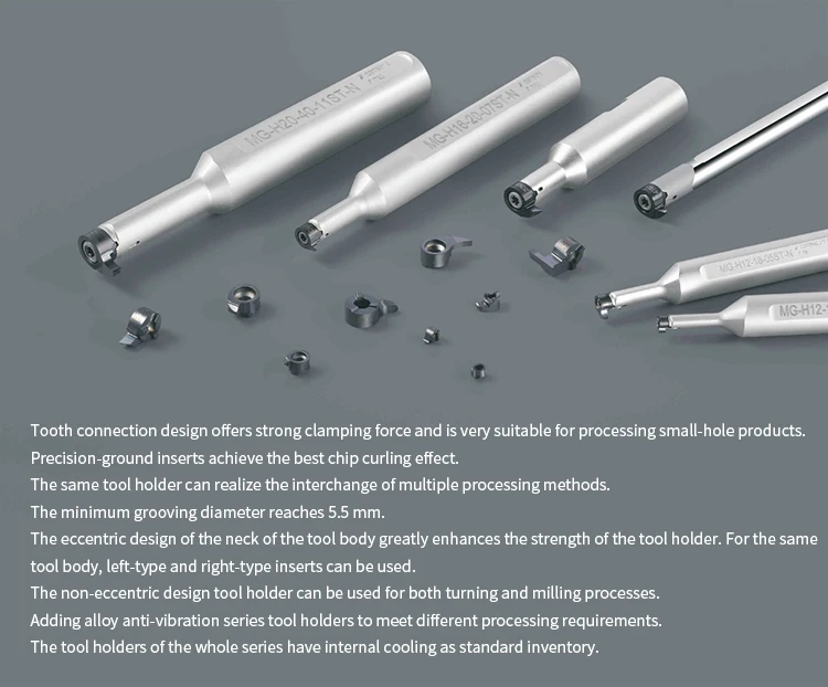 Feature | Tooth connection design offers strong clamping force and is very suitable for processing small-hole products. Precision-ground inserts achieve the best chip curling effect. The same tool holder can realize the interchange of multiple processing methods. The minimum grooving diameter reaches 5.5 mm. The eccentric design of the neck of the tool body greatly enhances the strength of the tool holder. For the same tool body, left-type and right-type inserts can be usec The non-eccentric design tool holder can be used for both turning and milling processes. Adding alloy anti-vibration series tool holders to meet different processing requirements. The tool holders of the whole series have internal cooling as standard inventory. |