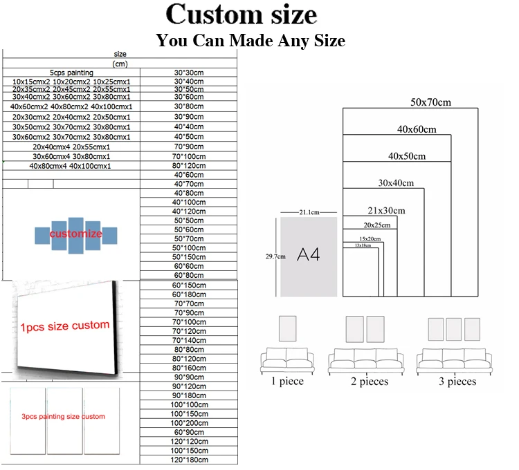 Size | CM Sizes:30x40cm,40x50cm,40x80cm,50x50cm,50x60cm,50x70cm,50x80cm,50x100cm,60x60cm,60x80cm,60x90cm,60x120cm,70x140cm,80x80cm,100x100cm customize any size |
