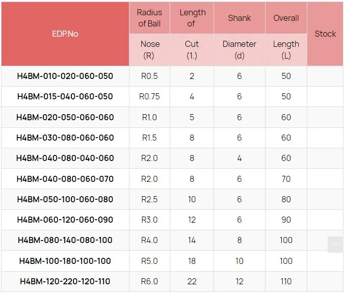 Model Number | H+SERIES BALL ENDMILLS |