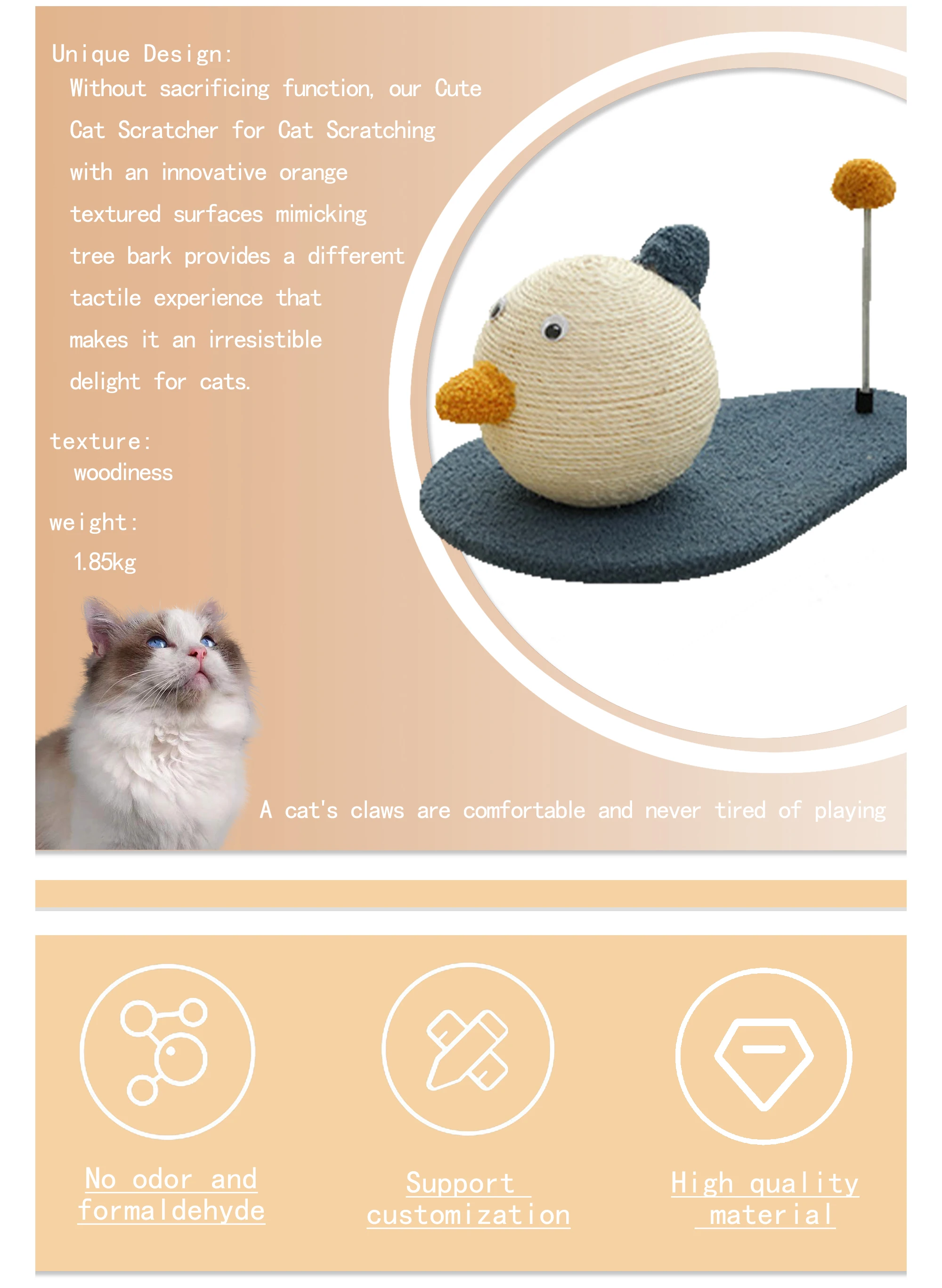 Made with odourless natural sisal, Strong & stable fir wood, SGS TUV certified formaldehyde free and soft plush, eco-friendly and sturdy for long-lasting usage.