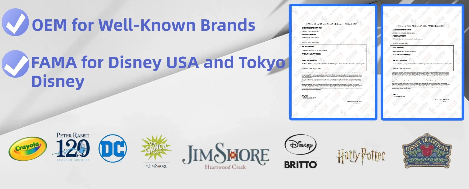 We have obtained Disney authorization and passed professional certification by Intertek. Our products, from raw materials to finished goods, comply with various environmental standards, ensuring eco-friendliness. |