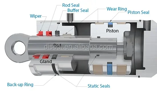Hydraulic cylinder seals are used to seal the opening between various components in the hydraulic cylinder. They are designed to retain hydraulic fluids, exclude solid or liquid contaminants, and maintain hydraulic pressure. These tasks require a variety of different seal designs and performance-enhancing features. Seal material must conform to irregularities in metal surfaces to block fluid passage. To adjust to clearance gap size changes, the seal must expand or compress rapidly to follow dimensional variations. Finally, to resist being extruded into gaps, the seal must have sufficient modulus and hardness to withstand shear stress produced by system pressure.