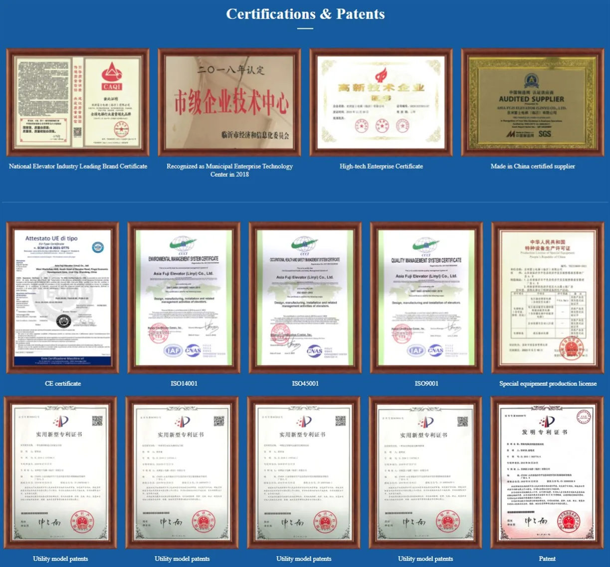 Linyi Fuji Elevator has obtained the A qualification certificate of one-stop service of production, manufacturing, installation and maintenance approved by the state. We have obtained honors like the "National Quality Inspection Stable and Qualified Products", "National Quality and Honest Outstanding Enterprise" and "High-tech Enterprise" and has won 15 patents in the elevator industry.