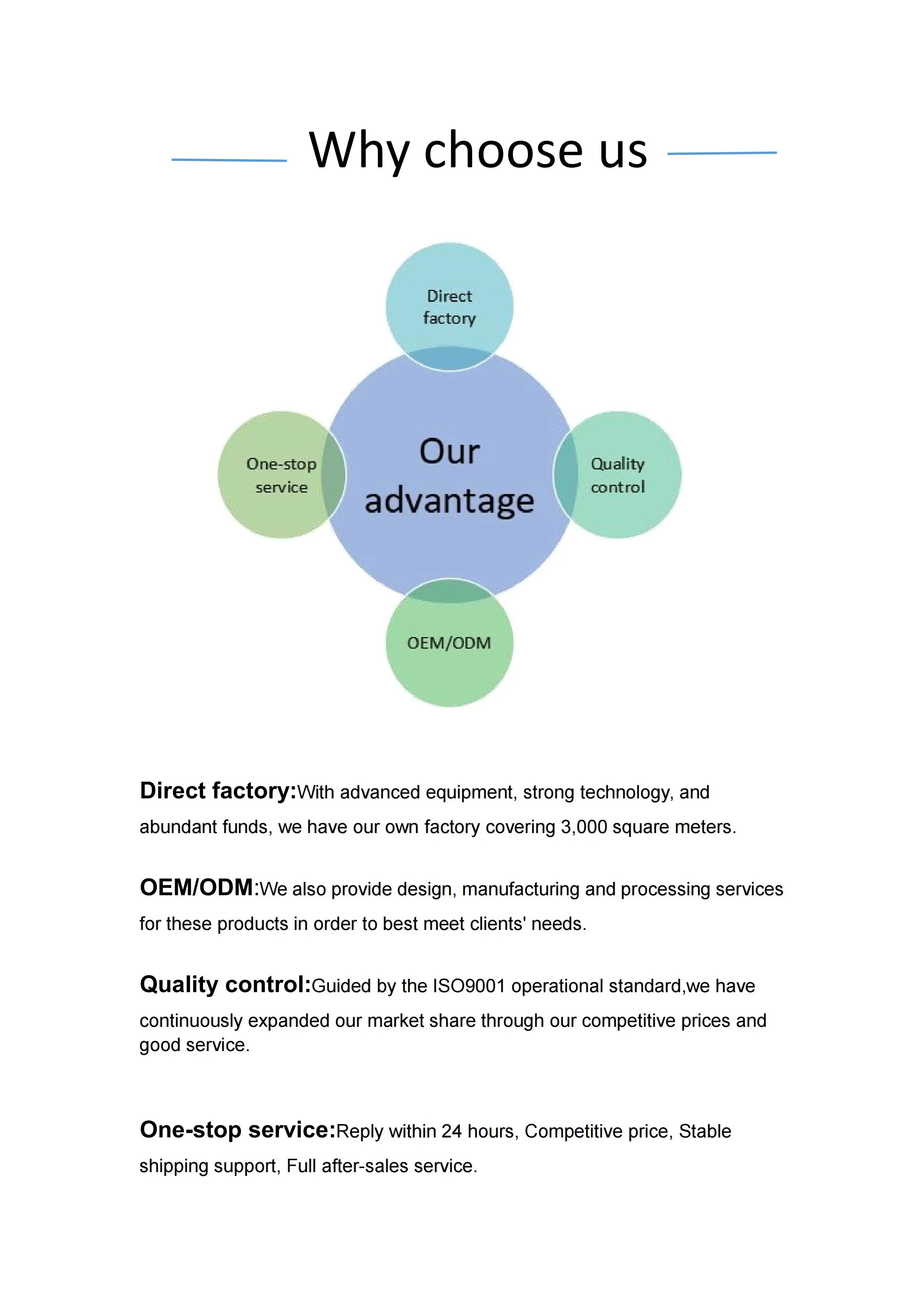 Q5:How do you treat quality complaint? A:First our quality control will reduce quality issue to near zero.And we will send you free goods for replacement or refund your loss for any quality issue.
