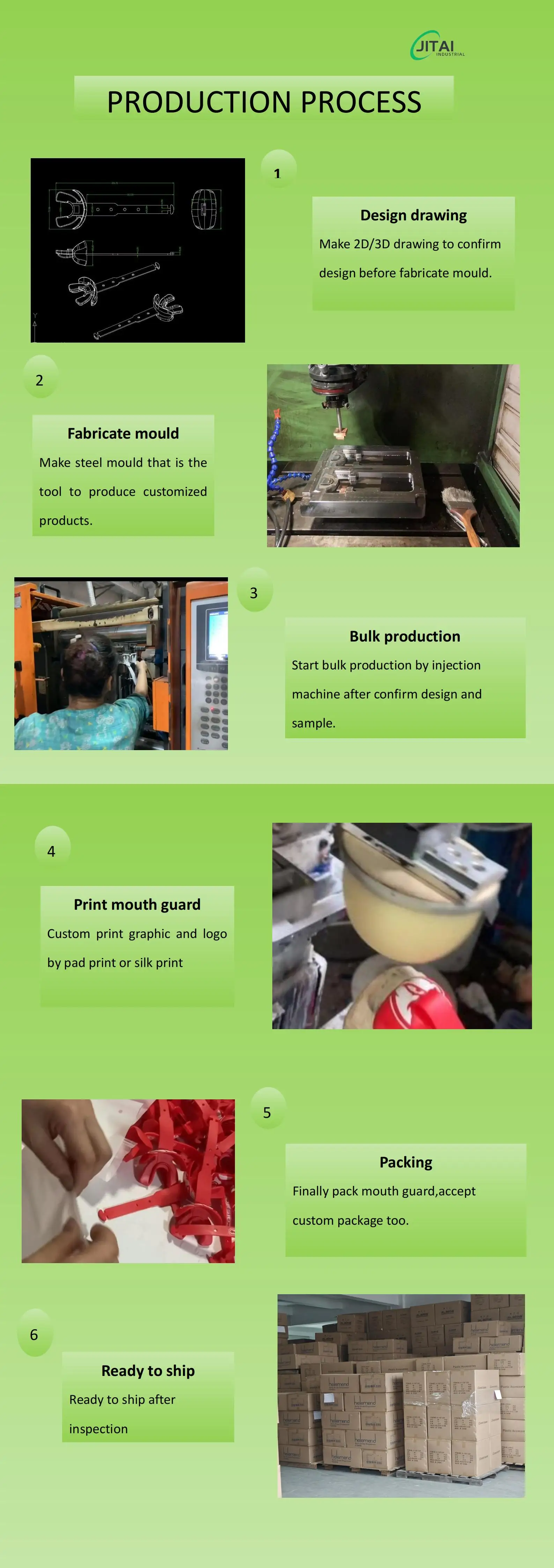 Shenzhen Jitai industrial founded in year 2001,complying with ISO 9001 quality control systerm,audited by BSCI is a leading manufacture in the fields of silicone rubber and plastic products.Our products include but not limited to mouth guard,football