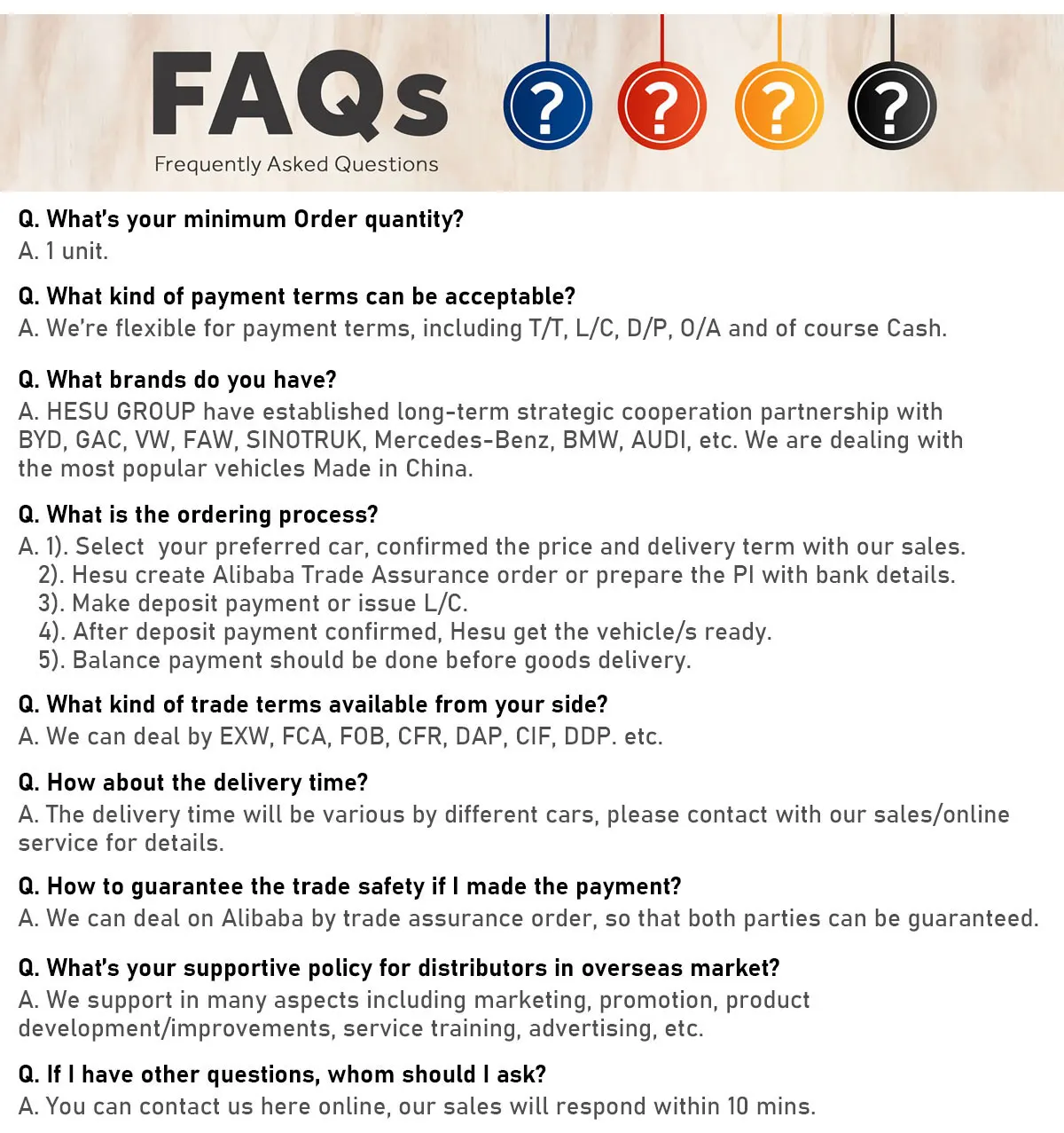 The more informations you offer us, the more quick and accurate quotation will be offered. Since the Stock cars are selling very quickly, it is possible sold out after confirm all the informations with you around by around. However, we accept that you pay the 30% for deposit to order the cars,