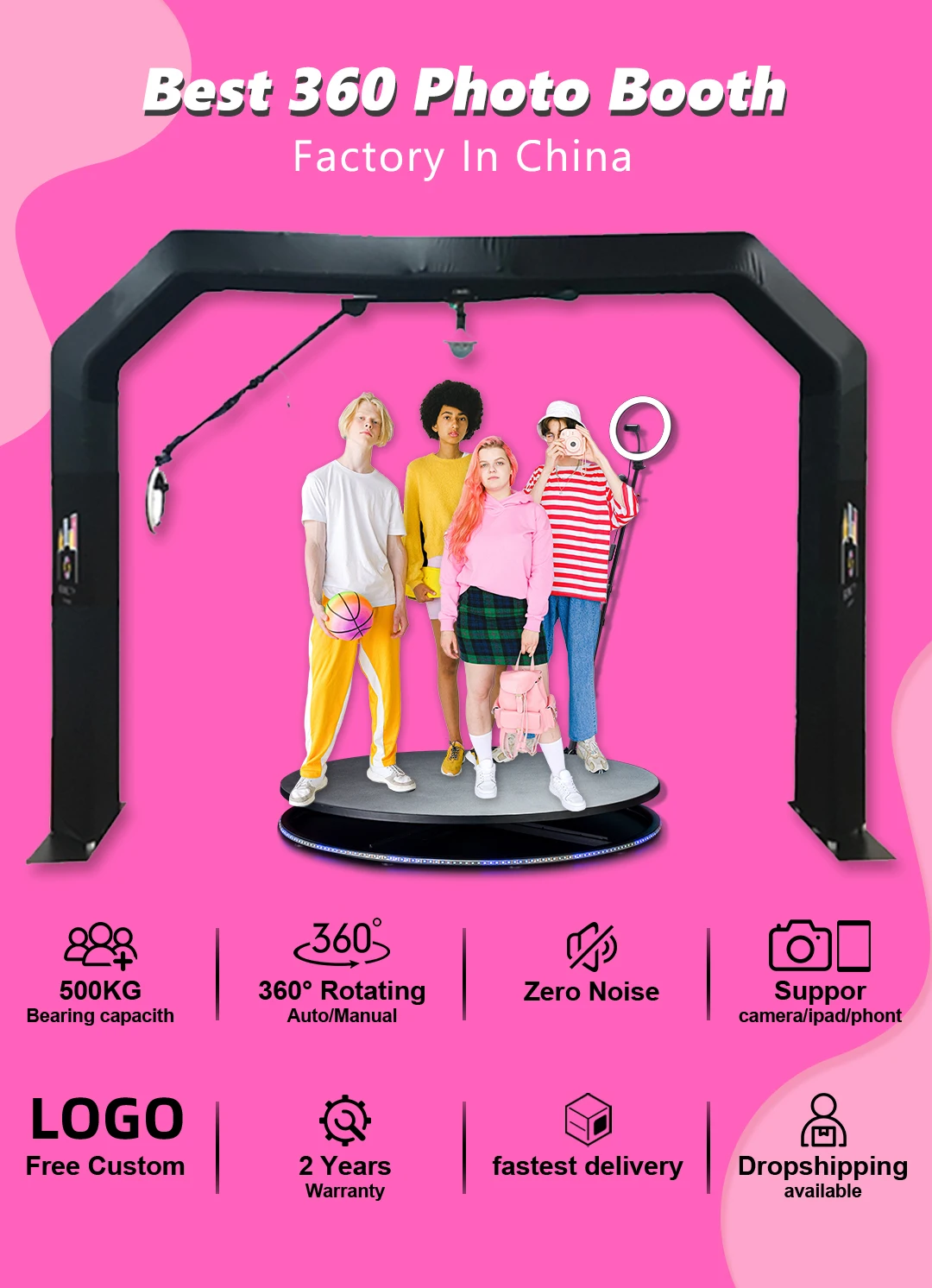 1. Are you a factory specializing in party supplies? Yes,we are engaged to develop party supplies and wedding supplies. We have 360 photo booth,overhead 360 photo booth,360 photo botoh enclosure backdrop, ipad photo booth,mirror photo booth and many more Customizable party supplies. 2.Where do you have overseas warehouses? Overseas warehouse Stock In United States、EU、South Africa
