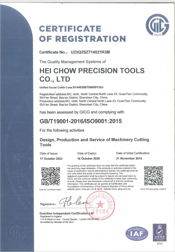 With more than 280 employees, HEI CHOW PRECISION TOOLS CO., LTD has set up marketing and after-sales service, engineering R&D and design department, manufacturing department, quality testing centre and other departments. We provide customized products and solutions to our customers using leading technology, exquisite craftsmanship and excellent service.